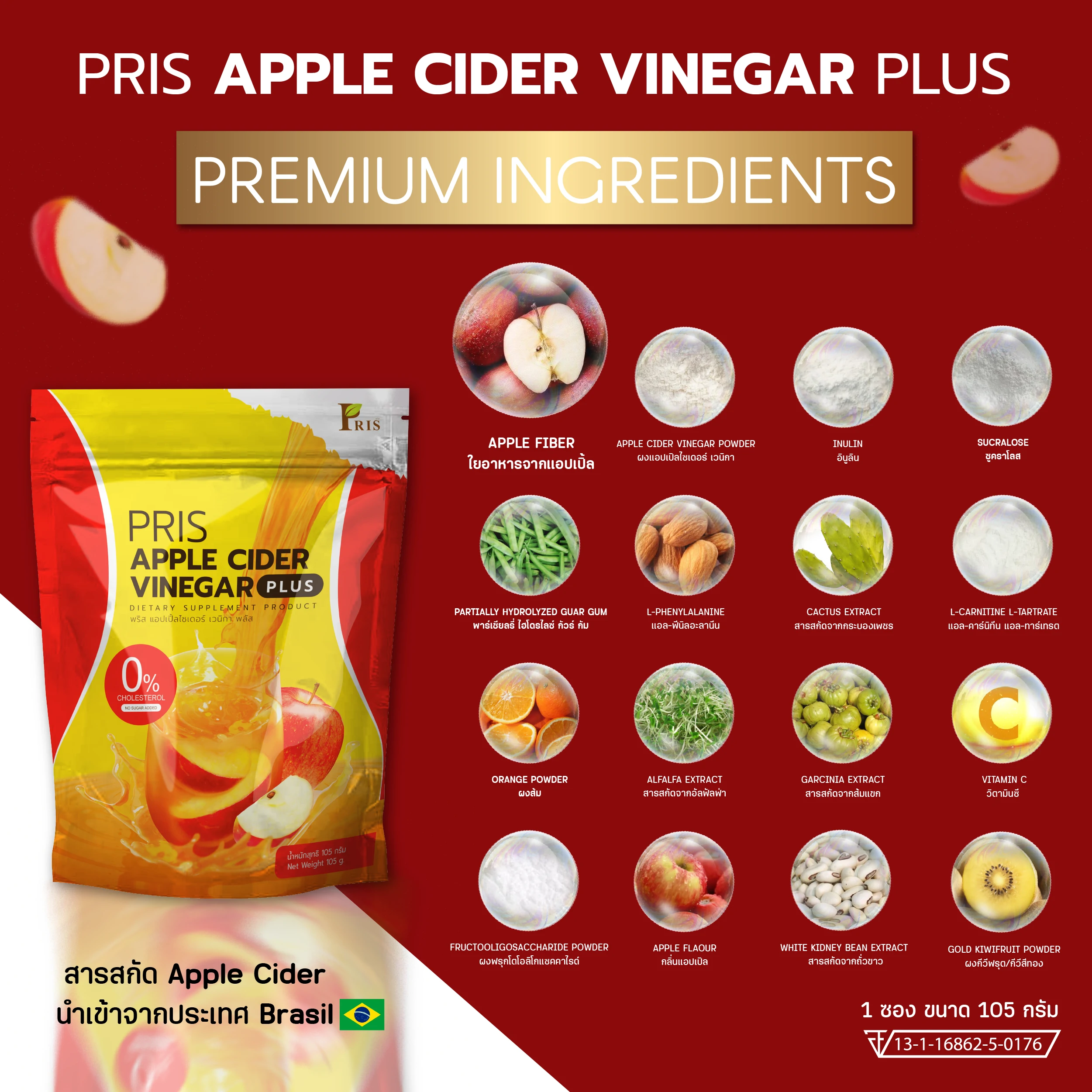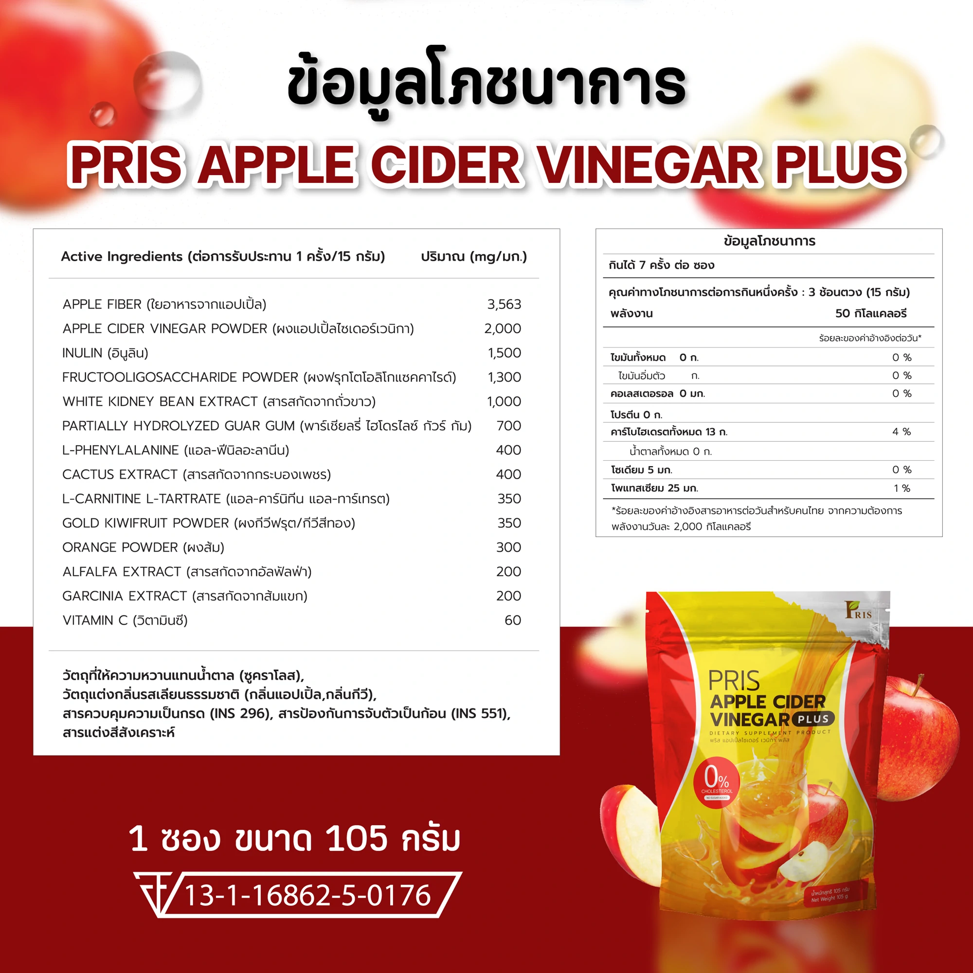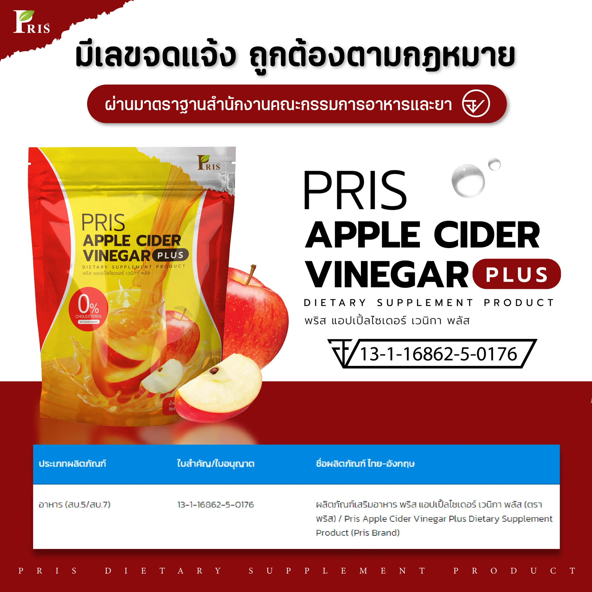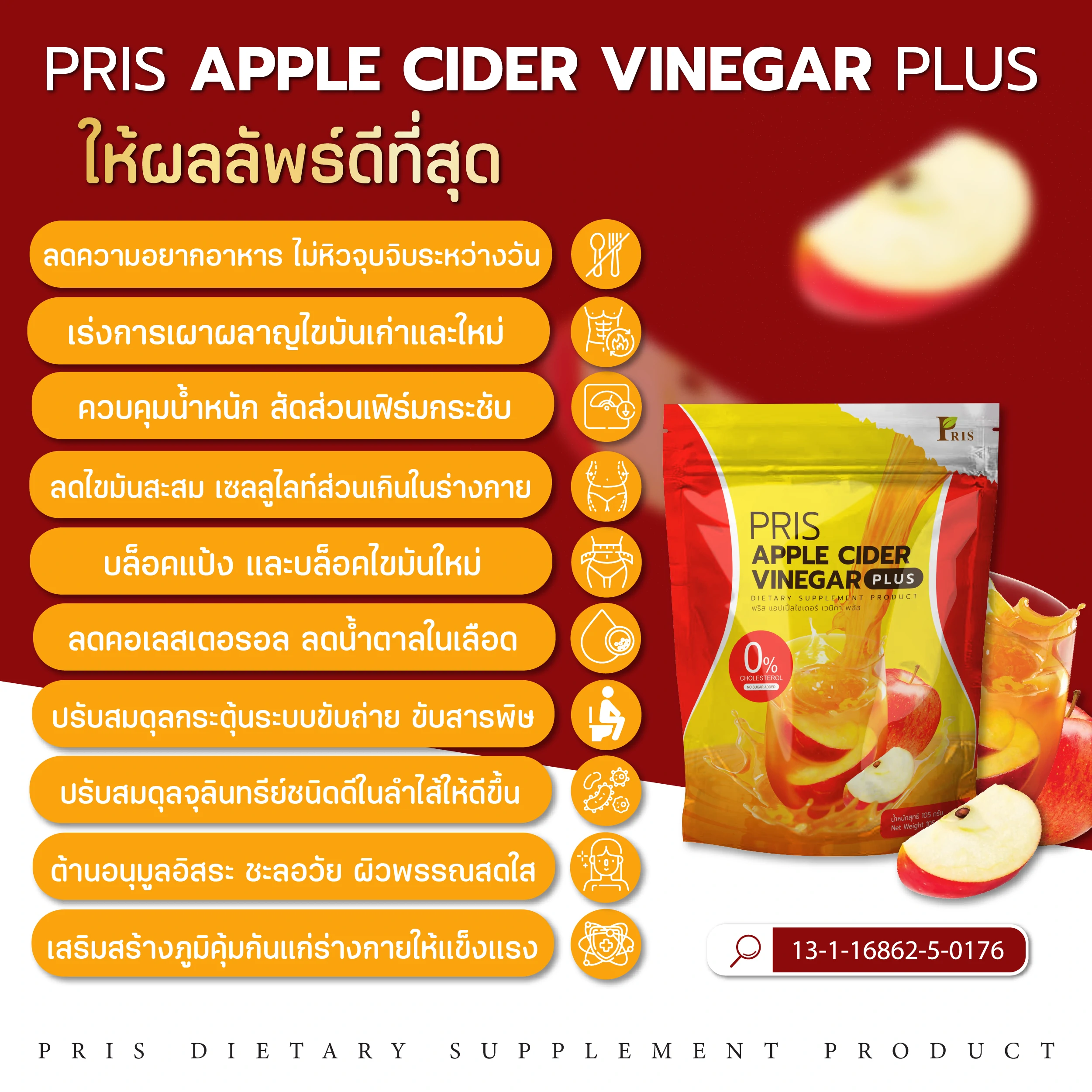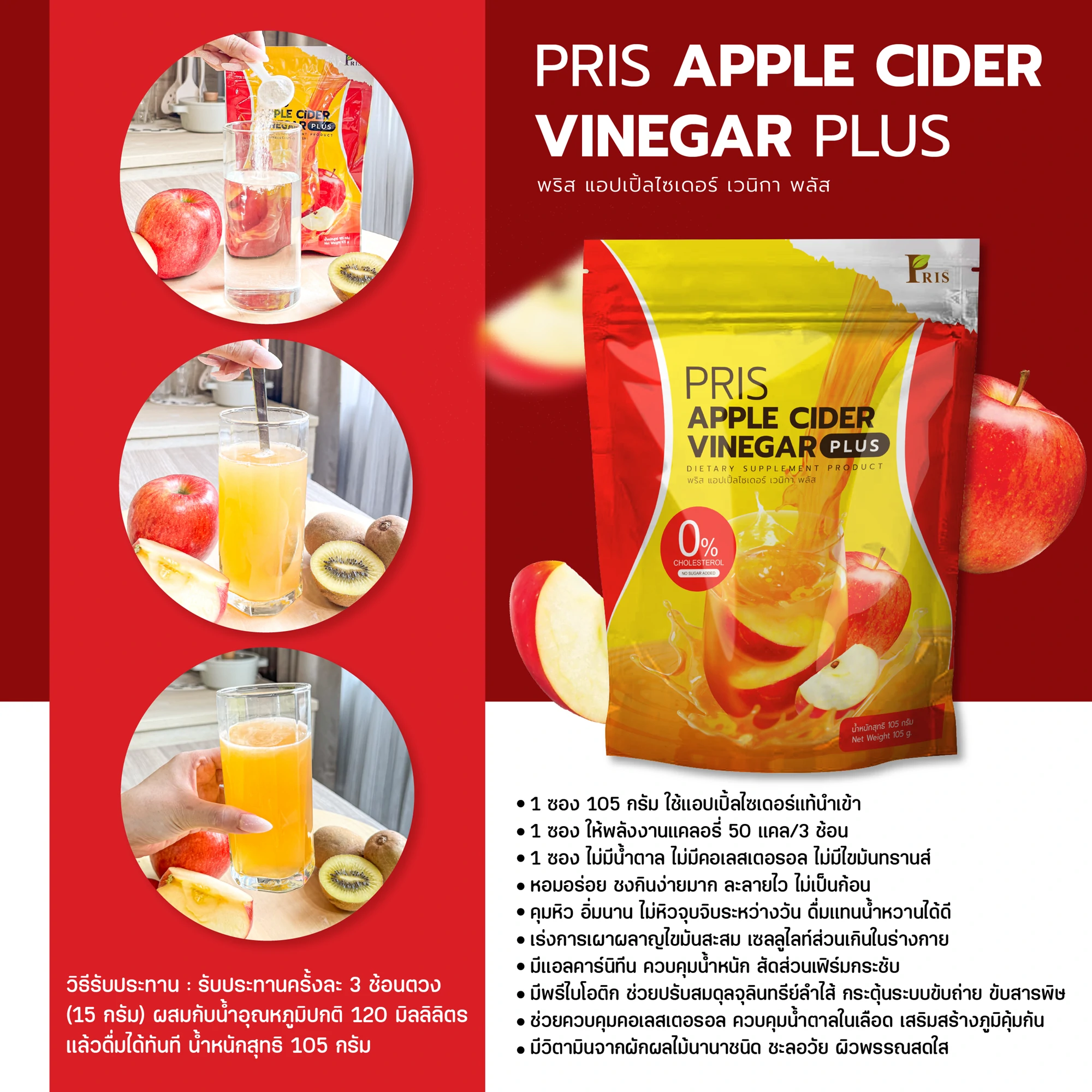 ผลิตภัณฑ์เสริมอาหาร พริส แอปเปิ้ลไซเดอร์ เวนิกา พลัส รสชาติหอม อร่อย กลมกล่อม ที่เป็นสูตรเฉพาะของแบรนด์ PRIS ที่ช่วยแก้ปัญหารูปร่างได้อย่างตรงจุด มี APPLE CIDER VINEGAR POWDER ควบคุมน้ำหนัก สัดส่วนเฟิร์มกระชับ ควบคุมความอยากอาหาร ไม่หิวจุบจิบระหว่างวัน มี L-Carnitine L-Tartrate เร่งการเผาผลาญไขมันเก่าและใหม่ ลดไขมันสะสม เซลลูไลท์ส่วนเกินในร่างกาย ยังมีพรีไบโอติก ที่ช่วยปรับสมดุลจุลินทรีย์ชนิดดีในลำไส้ให้สุขภาพดีขึ้น กระตุ้นระบบขับถ่าย ขับสารพิษ ช่วยควบคุมคอเลสเตอรอล ควบคุมน้ำตาลในเลือด และวิตามินจากผักผลไม้นานาชนิด ที่ช่วยต้านอนุมูลอิสระ ชะลอวัย เพิ่มความชุ่มชื่นให้แก่ผิว เสริมสร้างภูมิคุ้มกัน ของร่างกายให้แข็งแรง สุขภาพดี และผิวพรรณสดใส ภายในสู่ภายนอก