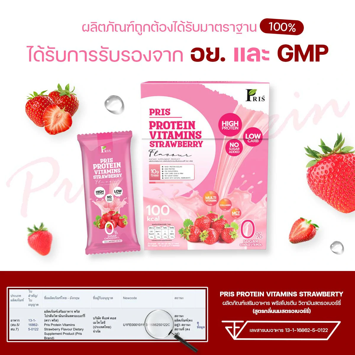 ผลิตภัณฑ์เสริมอาหารโปรตีนด้วยรสชาติหอม อร่อย กลมกล่อม ที่เป็นสูตรเฉพาะของแบรนด์ PRIS ที่ช่วยในการสังเคราะห์โปรตีนเพื่อเสริมสร้างกล้ามเนื้อ ช่วยในการเจริญเติบโตของกล้ามเนื้อ กระตุ้นการเผาผลาญของร่างกาย ดักจับไขมันส่วนเกิน ลดความดัน ลดไขมัน LDL ที่มีผลทำให้เกิดโรคความดัน ปรับสมดุลของเอนไซม์อินซูลิน ทำให้ระดับน้ำตาลในเลือดมีความสมดุล กระตุ้นการไหลเวียนของโลหิต อีกทั้งยังดูแลรูปร่าง สัดส่วนกระชับ ทดแทนมื้ออาหาร บํารุงสุขภาพ และช่วยชะลอความแก่ ต้านสารอนุมูลอิสระ ผิวพรรณสดใสภายในสู่ภายนอก