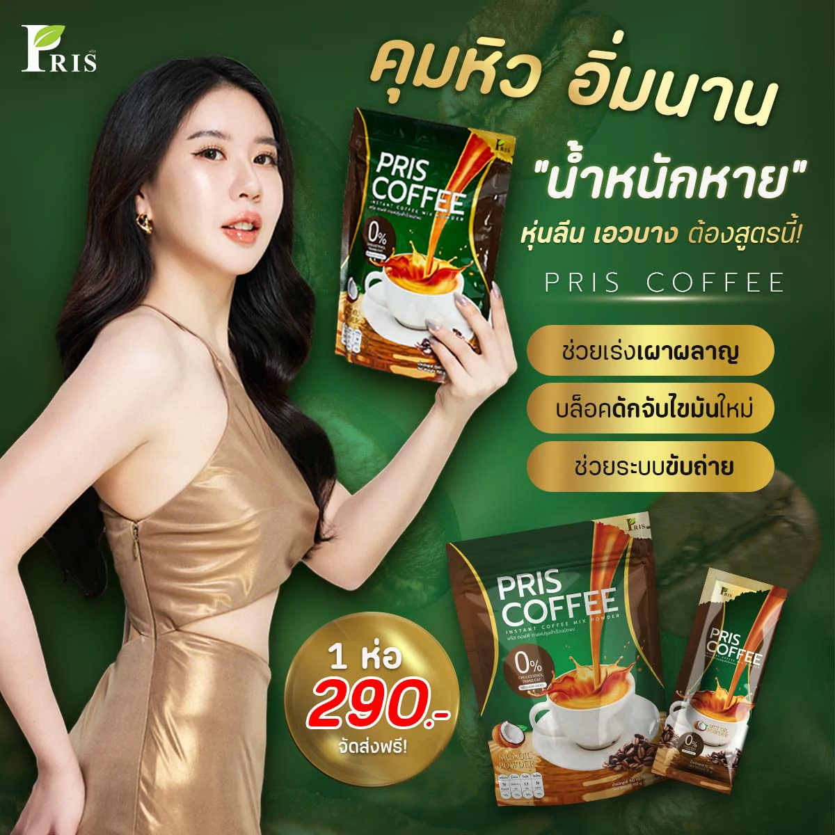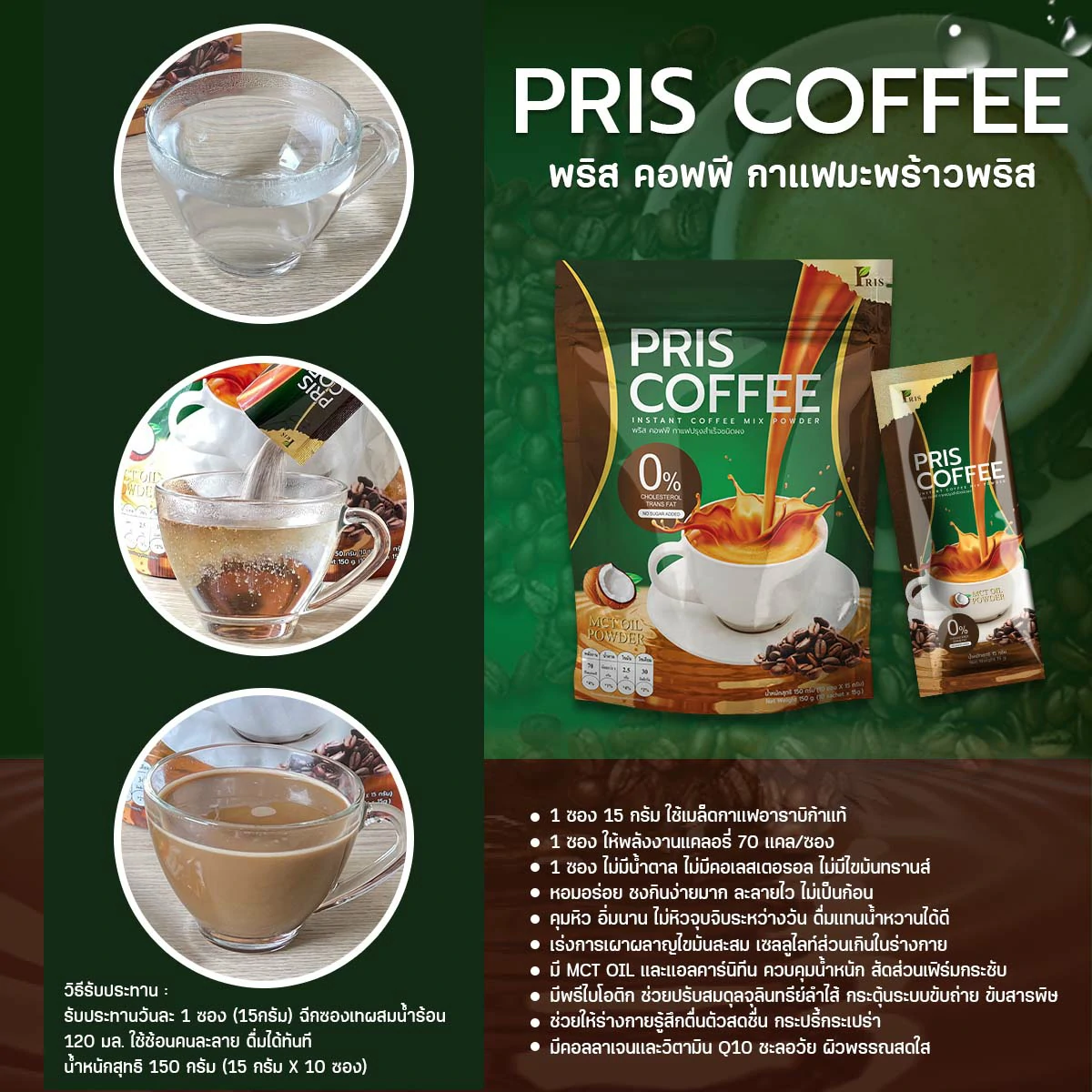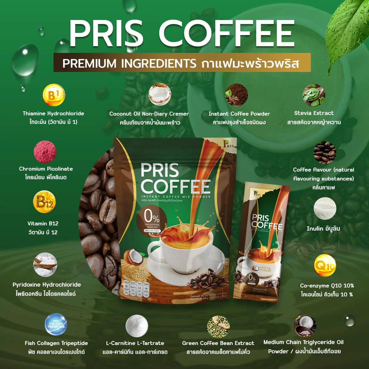 ผลิตภัณฑ์เสริมอาหารกาแฟปรุงสำเร็จชนิดผง รสชาติหอม อร่อย กลมกล่อม ที่เป็นสูตรเฉพาะของแบรนด์ PRIS ที่ช่วยแก้ปัญหารูปร่างได้อย่างตรงจุด ควบคุมน้ำหนัก สัดส่วนเฟิร์มกระชับ ควบคุมความอยากอาหาร ไม่หิวจุบจิบระหว่างวัน มี MCT Oil , L-Carnitine L-Tartrate เร่งการเผาผลาญไขมันเก่าและใหม่ ลดไขมันสะสม เซลลูไลท์ส่วนเกินในร่างกาย ยังมีพรีไบโอติก ช่วยปรับสมดุลจุลินทรีย์ชนิดดีในลำไส้ให้ดีขึ้น กระตุ้นระบบขับถ่าย ขับสารพิษ ช่วยควบคุมคอเลสเตอรอล ควบคุมน้ำตาลในเลือด และมี Fish Collagen Tripeptide, Co-enzyme Q10 และวิตามินรวมอีกหลากหลายชนิด ที่ช่วยต้านอนุมูลอิสระ ชะลอวัย เพิ่มความชุ่มชื่นให้แก่ผิว เสริมสร้างภูมิคุ้มกันของร่างกายให้แข็งแรง ให้ร่างกายรู้สึกตื่นตัวสดชื่น สุขภาพดี และผิวพรรณสดใสภายในสู่ภายนอก