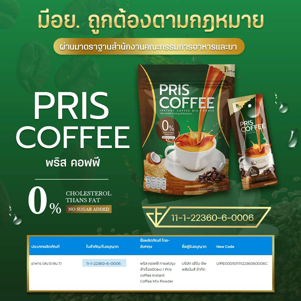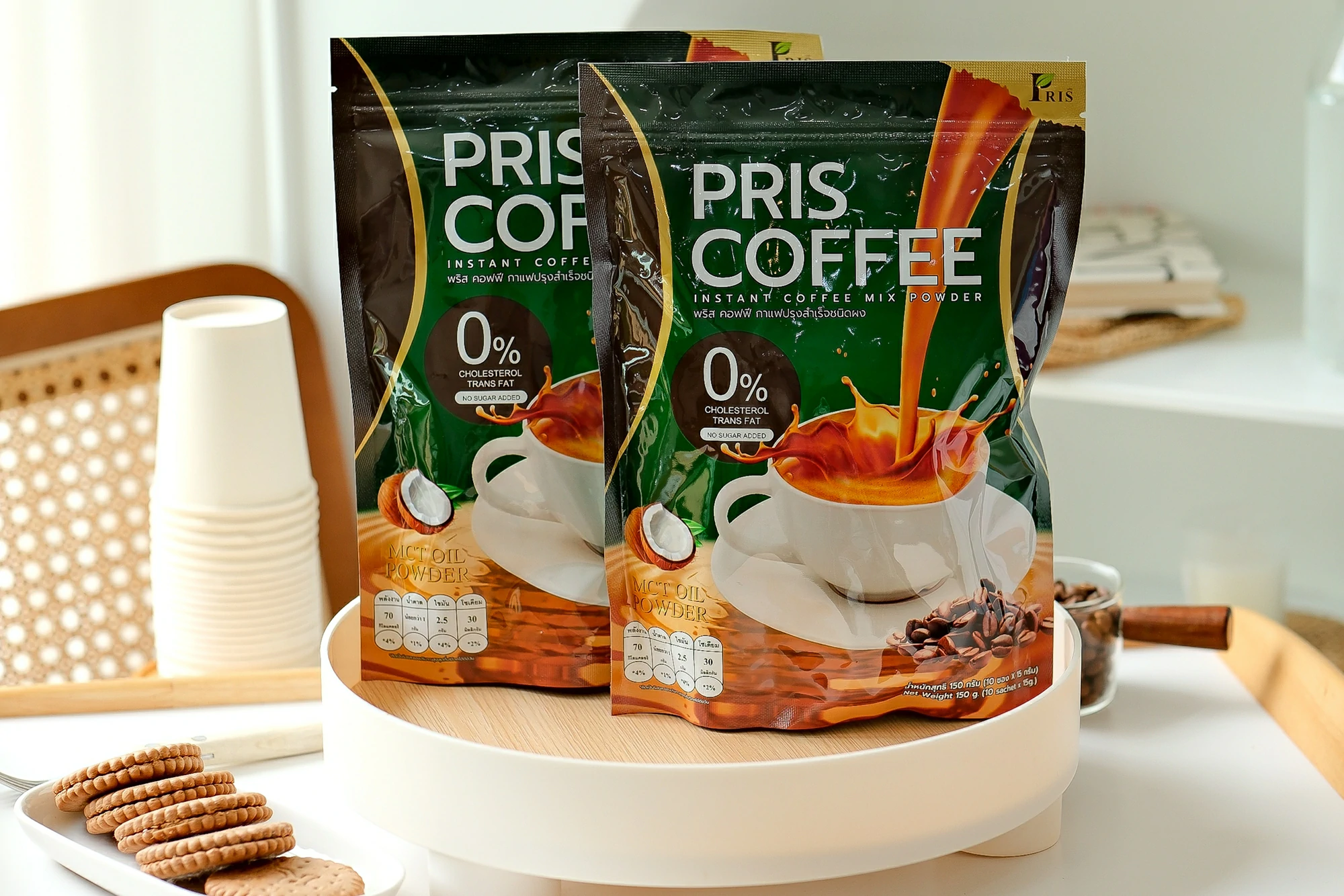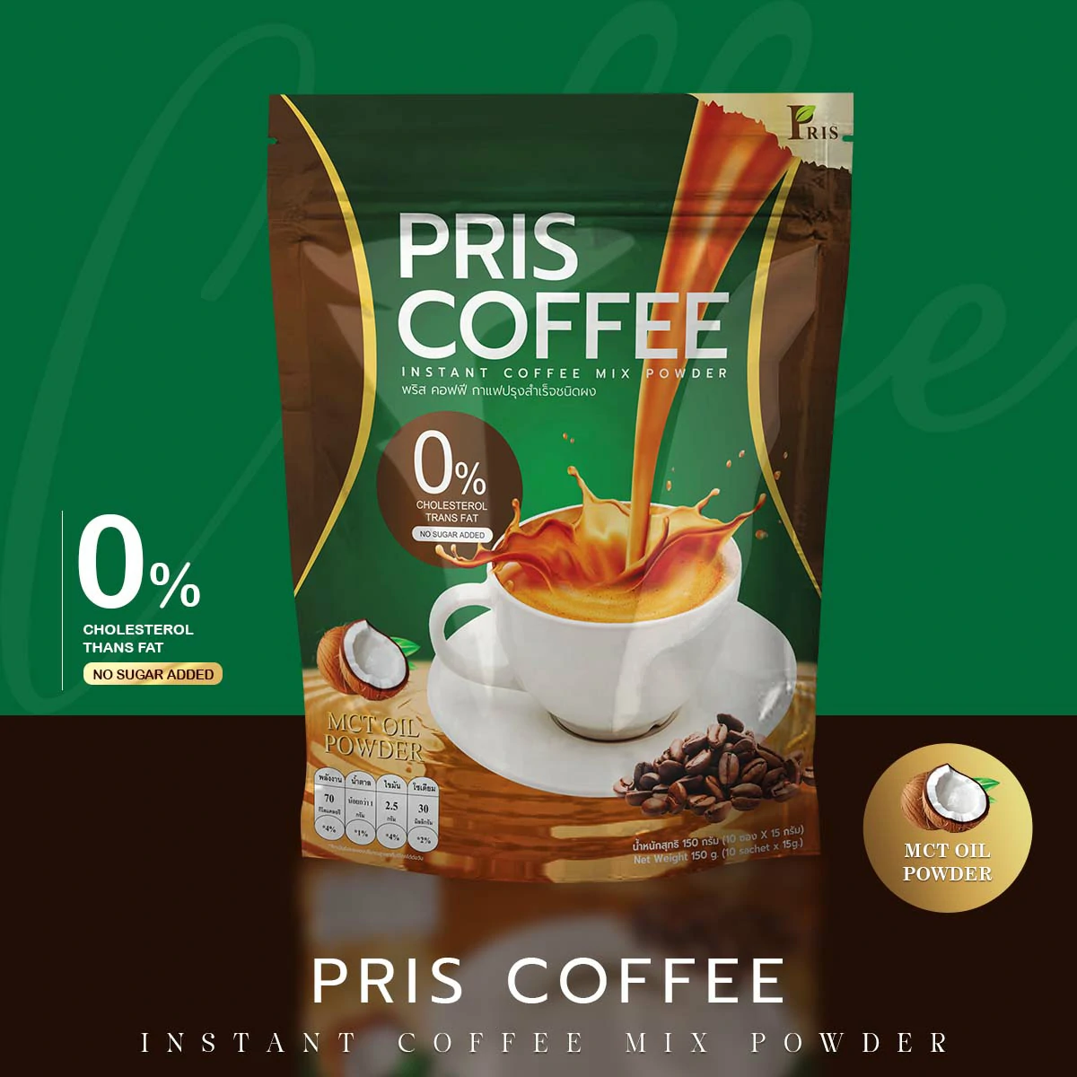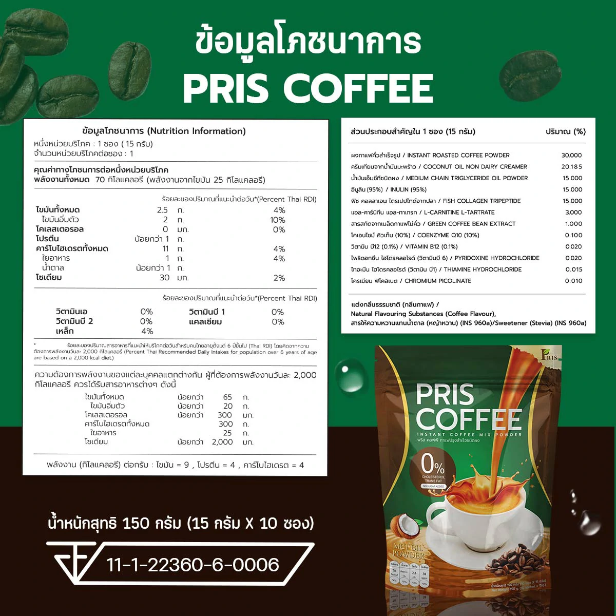 ผลิตภัณฑ์เสริมอาหารกาแฟปรุงสำเร็จชนิดผง รสชาติหอม อร่อย กลมกล่อม ที่เป็นสูตรเฉพาะของแบรนด์ PRIS ที่ช่วยแก้ปัญหารูปร่างได้อย่างตรงจุด ควบคุมน้ำหนัก สัดส่วนเฟิร์มกระชับ ควบคุมความอยากอาหาร ไม่หิวจุบจิบระหว่างวัน มี MCT Oil , L-Carnitine L-Tartrate เร่งการเผาผลาญไขมันเก่าและใหม่ ลดไขมันสะสม เซลลูไลท์ส่วนเกินในร่างกาย ยังมีพรีไบโอติก ช่วยปรับสมดุลจุลินทรีย์ชนิดดีในลำไส้ให้ดีขึ้น กระตุ้นระบบขับถ่าย ขับสารพิษ ช่วยควบคุมคอเลสเตอรอล ควบคุมน้ำตาลในเลือด และมี Fish Collagen Tripeptide, Co-enzyme Q10 และวิตามินรวมอีกหลากหลายชนิด ที่ช่วยต้านอนุมูลอิสระ ชะลอวัย เพิ่มความชุ่มชื่นให้แก่ผิว เสริมสร้างภูมิคุ้มกันของร่างกายให้แข็งแรง ให้ร่างกายรู้สึกตื่นตัวสดชื่น สุขภาพดี และผิวพรรณสดใสภายในสู่ภายนอก